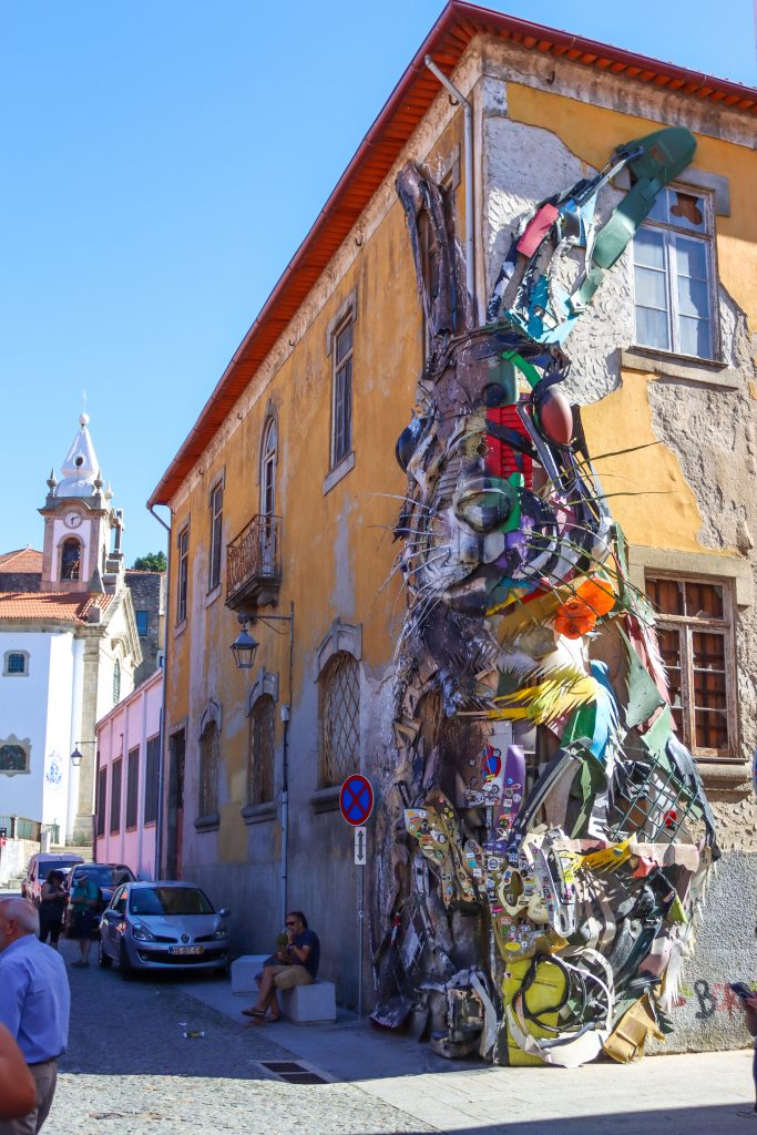 Porto Cathedral was over a hill and it allowed us to see the city view from a nice angle. I took some photos there and then we tried to go to the riverside of the city. When go down we went to the Ribeira area and there was a huge steel bridge. We walked around and there were some gift shops. The weather was hot and some people were jumping into the water from the riverside. After that, we passed through the bridge and wanted to rest on the other side of the river. When we see the cable car we decided to use that from down to the top of the bridge after rest. We walked to the WOW Porto area. On the wall, there was a half-rabbit statue on the wall. It was looking so cute. Then we went and sit in Mercado Beira-Ria to have some drinks and rest.